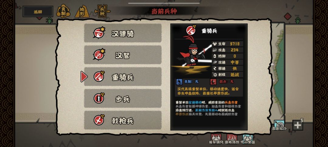 心血来潮想看看兵种会不会升级,记忆中刚研发汉骠骑的时候,骠骑的生命值是2000多。之后对比了一下发现似乎是每战斗一次生命值攻战斗力都会增长。而且汉骠骑生命值战斗力要比重骑兵要高,不知道是不是因为我用骠骑多的原因。汉军里步兵是唯一一个有防御数值的兵种,汉弩是攻击力最高的兵种,忘记截图了。