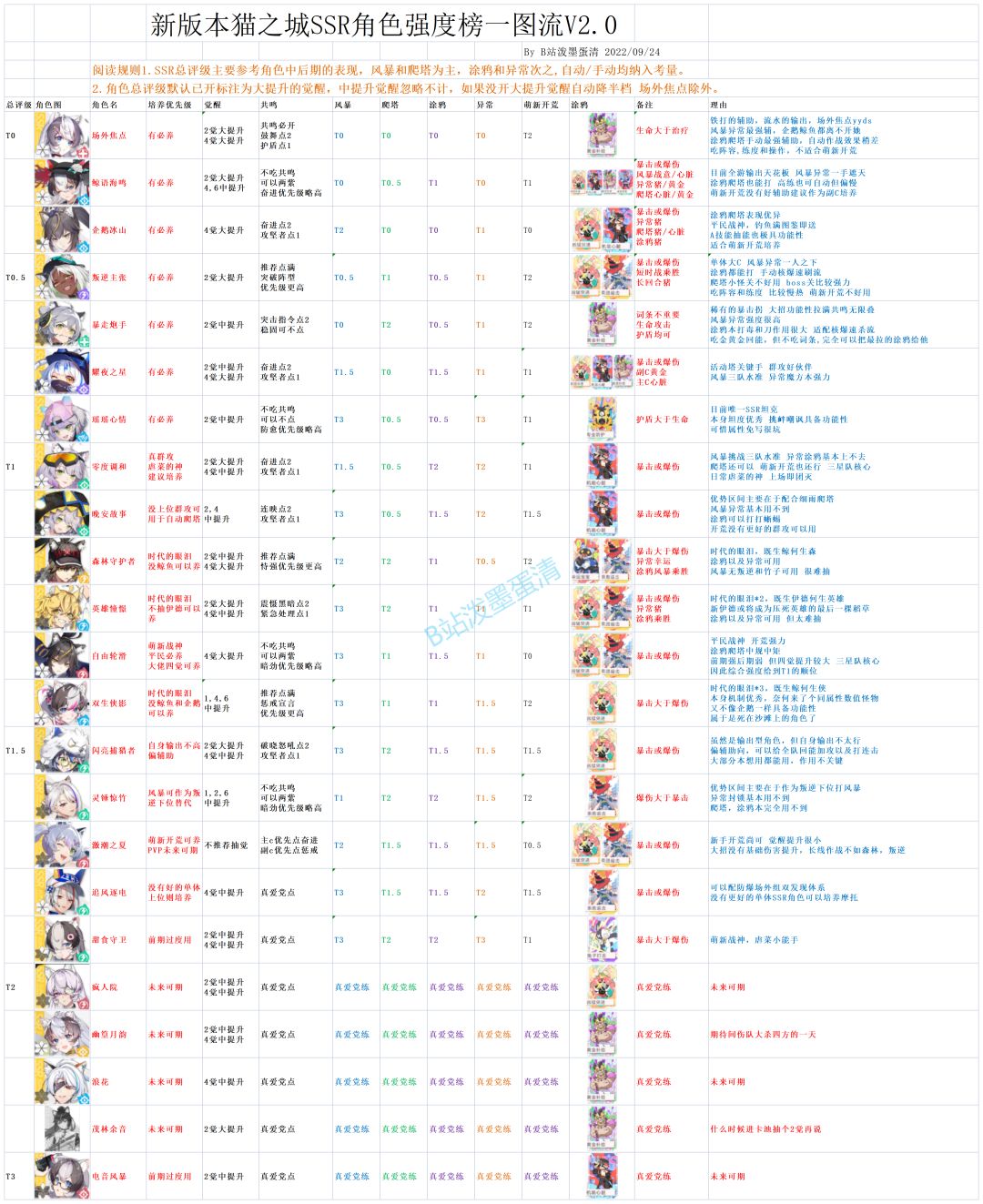 1.SSR角色强度榜一图流既包含角色总评级,亦包含角色分榜T度,如风暴挑战,爬塔,涂鸦本,异常封锁以及萌新开荒,还包含角色觉醒共鸣涂鸦以及培养优先级推荐,附带角色说明。