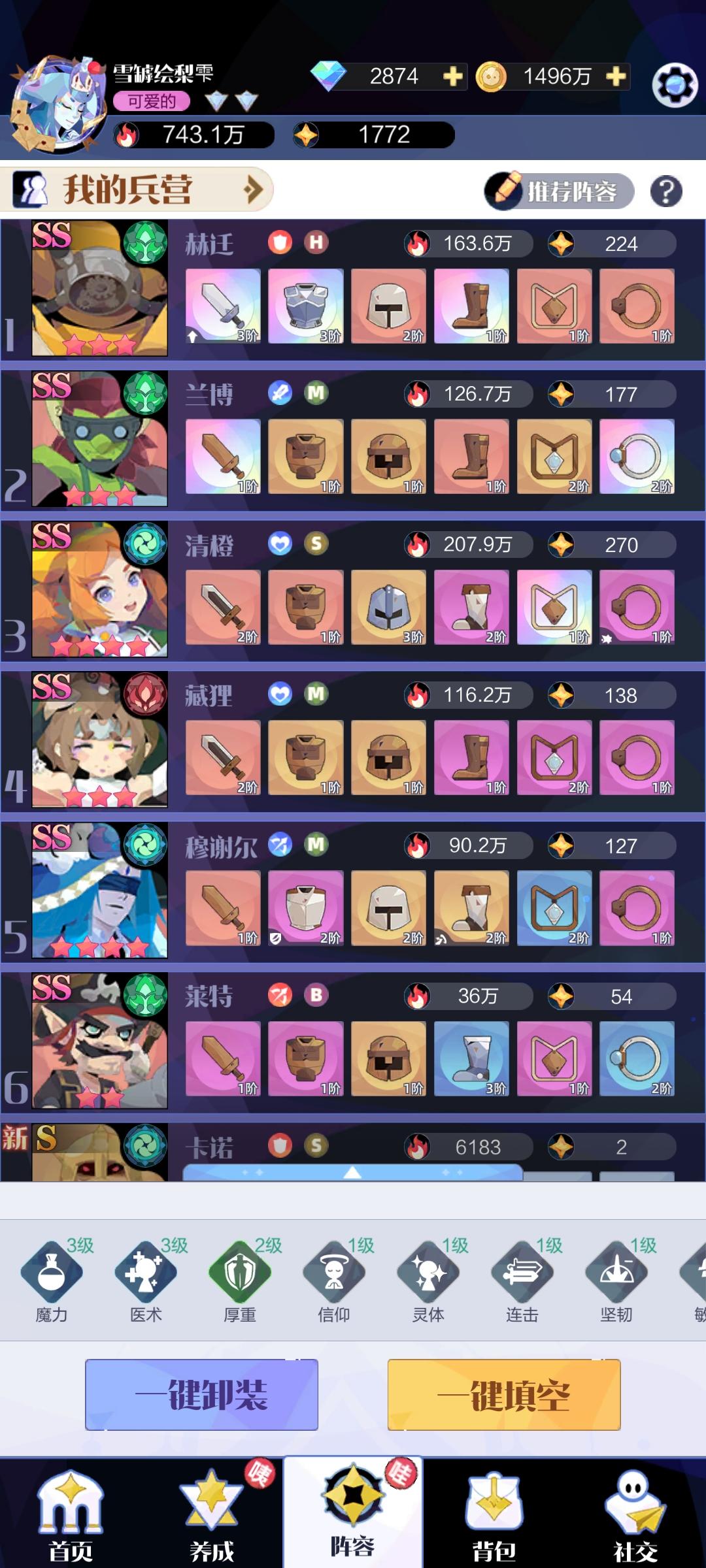 然后123号位主t副t奶 456号位奶+两后排 核心思路就是脂肪的力量 只要你破不了我的防我就磨死你 反正这游戏可以快进.. 经常自动战斗失败 进去督战血掉到百分30就是不死 磨一磨对面全没了
