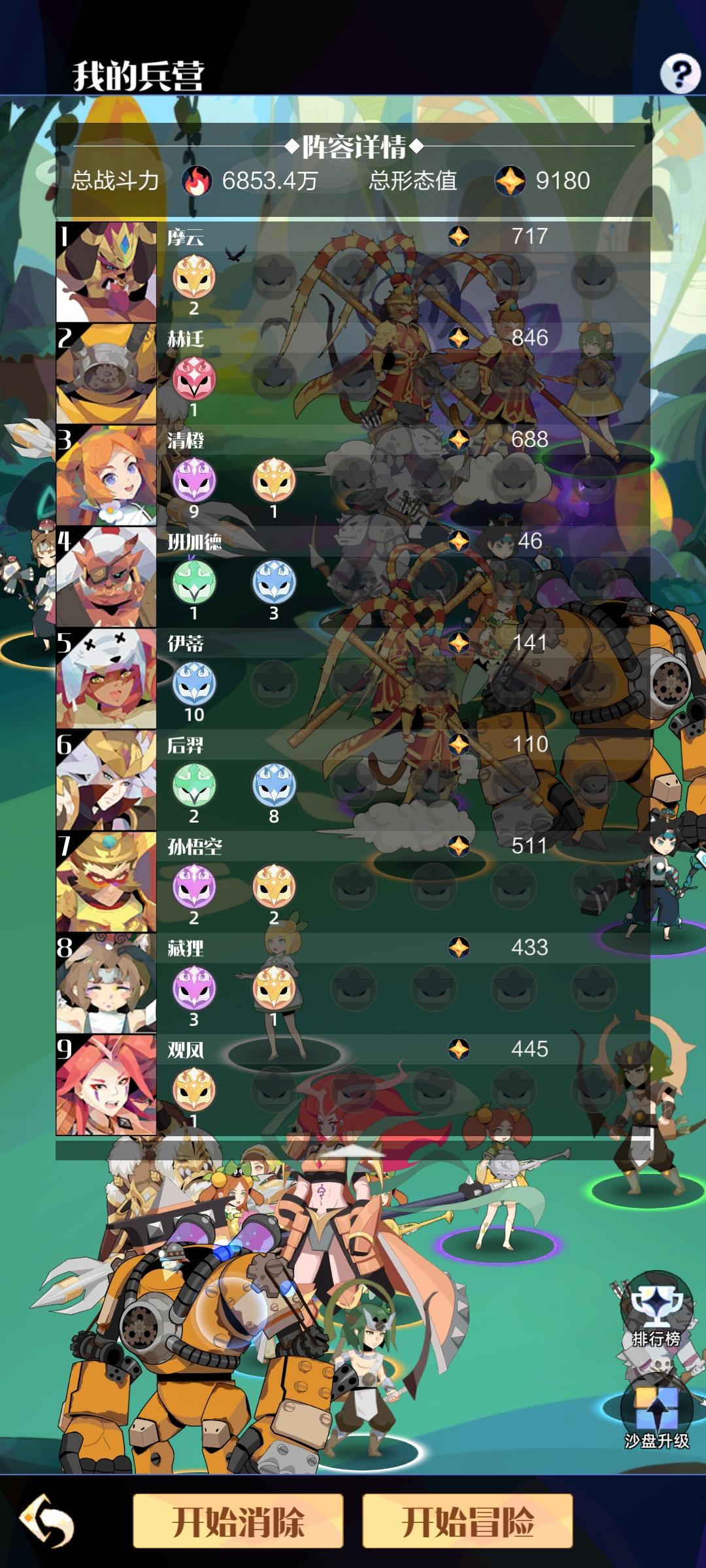 而且没有什么至臻就一个猴子还没ss 核心思路就是凑连携了 也没命石 就很正常的6级娴熟 照搬就好了 战力从高到低摩云 赫迁 清橙 猴子(因为我星级太低不放高点没啥用)藏狸 观凤 班加德 后裔工具人放到最后