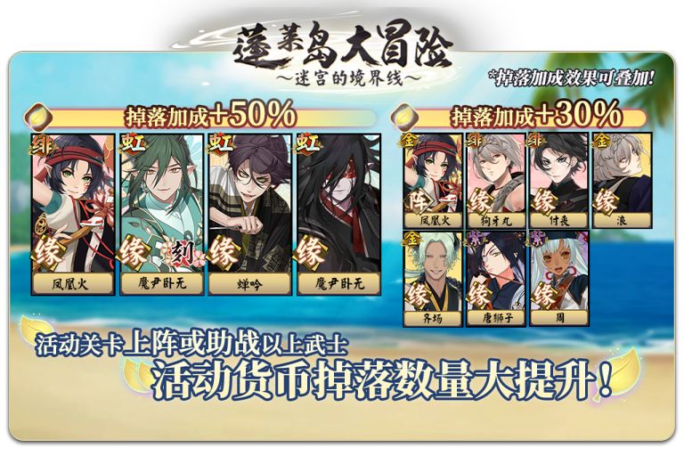 上阵或助战以下武士挑战活动关卡时【蓬莱树叶】的掉落增加(效果可叠加):