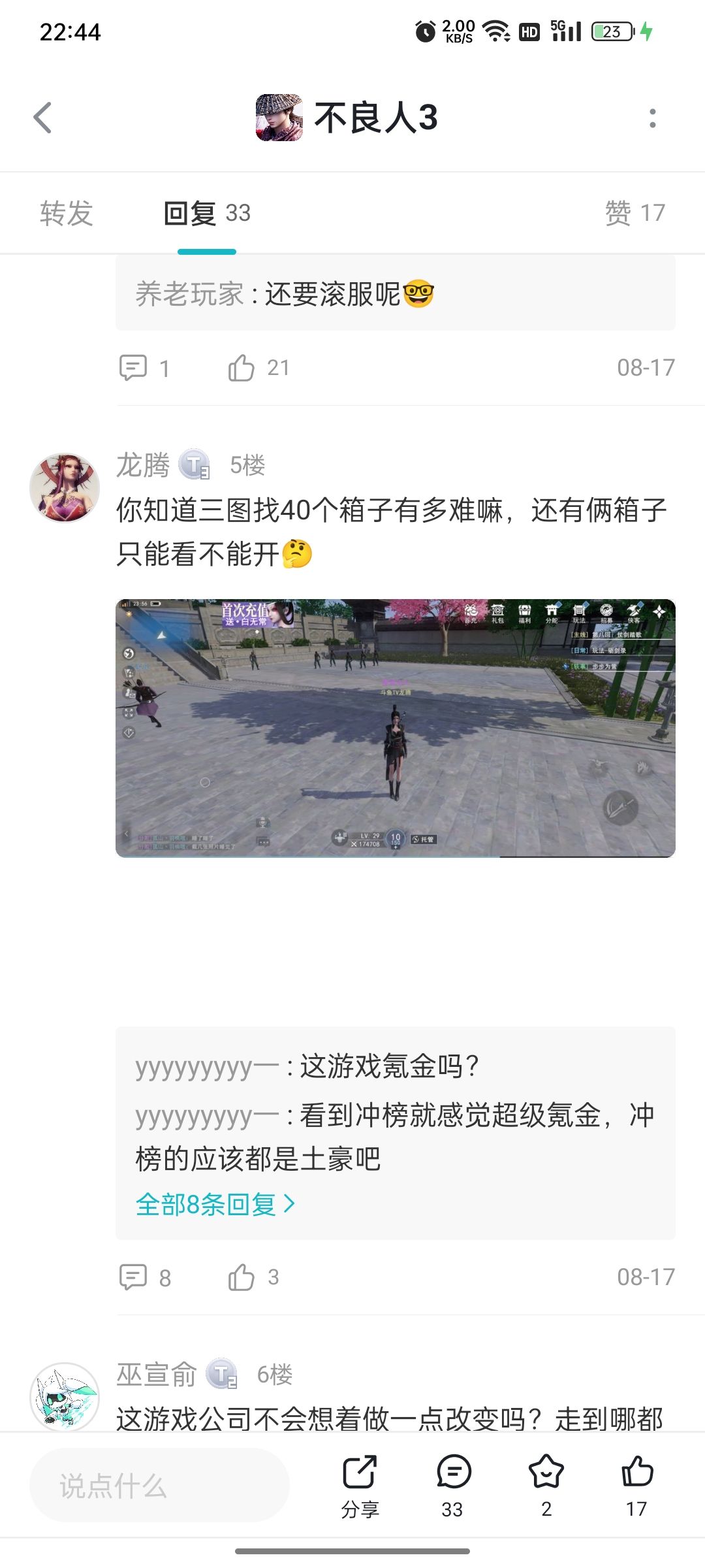 其他方面大大小小的问题就不说了,说点宝箱攻略合集版,目前网上各大论坛就tap宝箱比较全,直播我没看,现在也凉得不行,攻略群也没找到,问题也不大,靠着各位论坛好心大佬的分享,我终于在开服第二天仅开到渝州的情况下,拿到了39个宝箱,差一个,死活找不到,放弃了,哈哈。