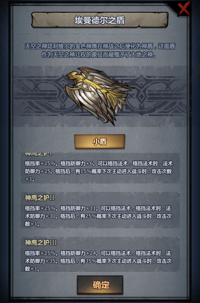 神器小盾:格挡时有概率下回合多攻击一次(这个效果会触发两次主动耗蓝的技能)。