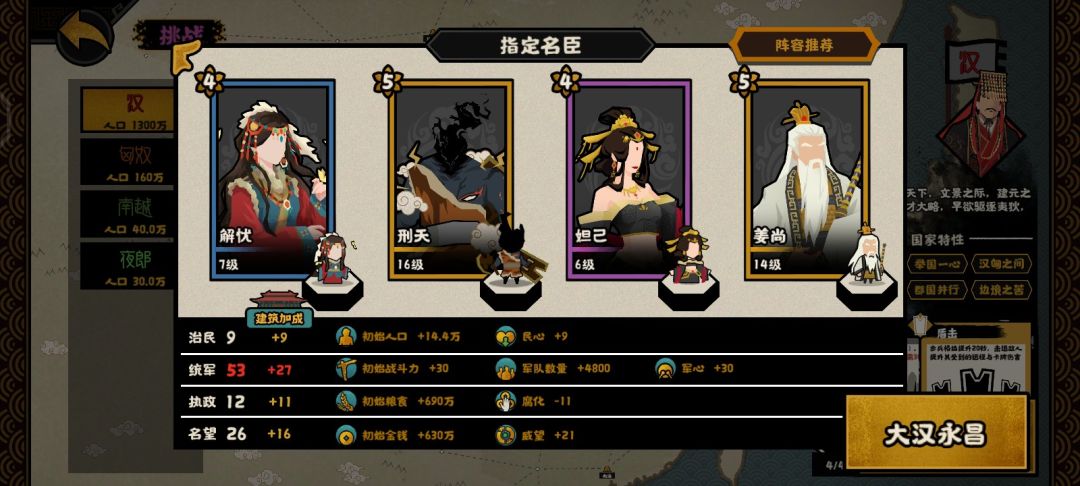 妲己:因为大汉开局腐化高,可以触发妲己的魅惑(可能铁差一个,可以换别的,陈平挑战模式削弱不了战力)