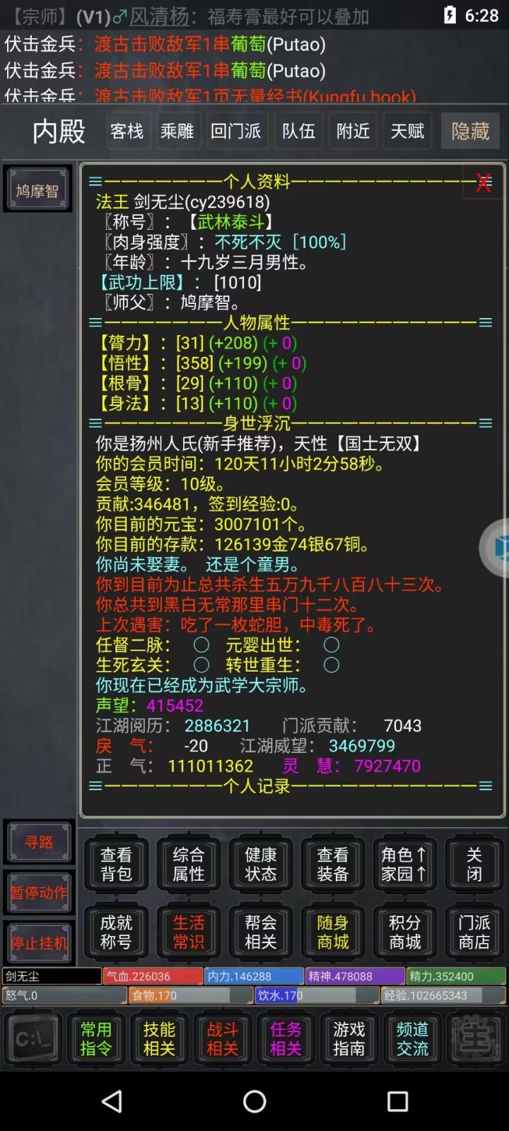 资源介绍:明教九阳极天下,乾坤挪移步武林。全真道教为正统,重阳宫中纯阳功。武当太极阴阳功,峨眉临济十二庄。逍遥北冥为奇功,凌波微步莫捉影。要问谁能书阁下,侠客岛中太玄经。天下武功出少林,金刚不坏易筋经。华山自古分二宗,独孤九剑当世绝。葵花辟邪鬼影剑,阉者亦能得天下。九阴神通远传名,逆练也得蛤蟆功。降龙掌中出乾坤,打狗棒里定江湖。你想体验在武林中大杀四方的感觉吗,你想体验一剑999的感觉吗, 你想拥有绝世神兵吗,你想左手拿着倚天右手拿着屠龙吗,想就快来跟我一起玩MUD。一个文字武侠挂机手游,多种多样的门派选择,逍遥,武当,华山,古墓,桃花等等,你可以选择一个门派从谁都打不过到谁都打不过