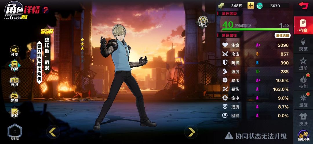 在《一拳超人》中,杰诺斯外号“经费战士”,是所有英雄中技能最炫酷的。他虽然是时常挨揍的“不胜传说”,但战力的进化速度可以与饿狼媲美,这也是为什么游戏中会有SR和SSR两个杰诺斯的原因。本篇文章,就来聊聊这位魔鬼改造人,说说围绕他应该如何构建阵容。