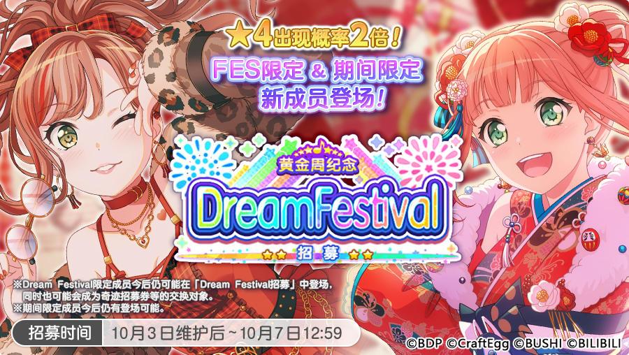 PS:10月7日「黄金周纪念 Dream Festival招募」结束后,游戏内将开启「可喜可贺 欢庆的黄道吉日招募」,新登场期间限定成员将在此招募中登场,Dream Festival限定成员不会在以上招募登场。