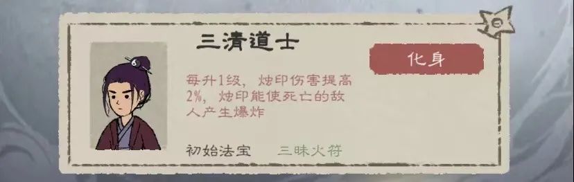人物我们选择三清道长,三清道长--每升1级,烛印的伤害便提高2%。(咱们本期的重磅人物,我愿称之为宇智波三清!)