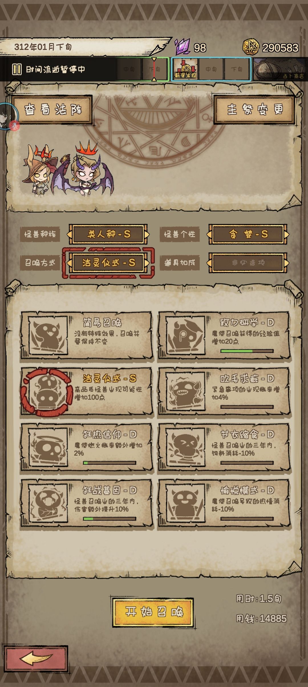 怎么说呢,其实我还没明白怎么玩就通关了,其实一天就可以通关,我大概加起来也没多久就通关了,我还稀里糊涂的,连s级法阵都没有,我个人觉得恶魔种挺强的,不过前期要是把类人种刷出来了可以先培养类人种到s级,因为后期有个任务要类人种达到s级,我前期刷出来了恶魔种搭配灾厄刷到s级,后期才领到类人种的任务,召唤其实挺推荐洁灵仪式的,因为刷到s级之后,几乎不管种类有没有s级都可以召唤出s级的就是热情度消耗比较快,刷到钥匙一定要买,因为钥匙出现之后可以转化魔使,可以加强召唤的怪兽,其实挺有意思的,这些大概就是我的个人推荐吧
