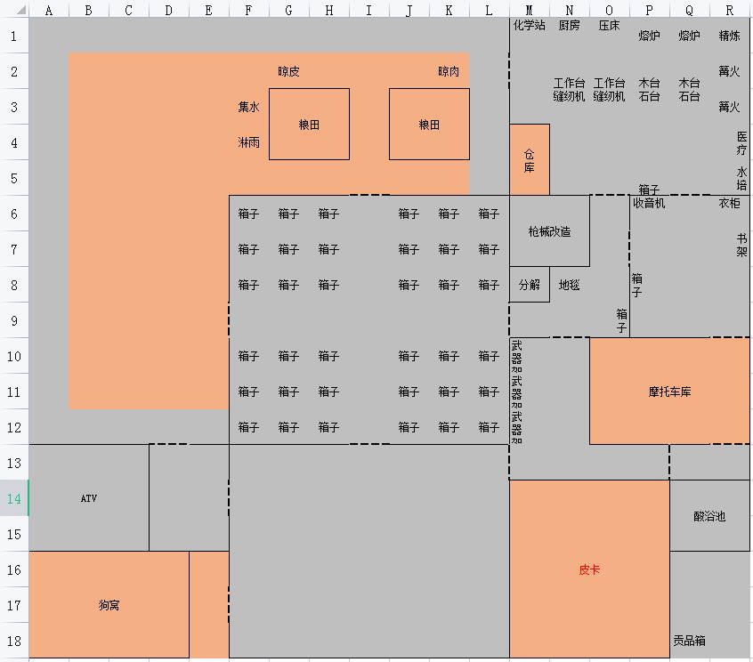 五分区是7*7的核心箱子,总共放了36个箱子进去,可以细分成武器、衣服、药品食物、零件四个小区域(根据箱子和花园区的对称性应该可以看出来我多少有点强迫症)五分区可以根据需要做家具防抄,上面部分种树,下面部分贴墙放家具。