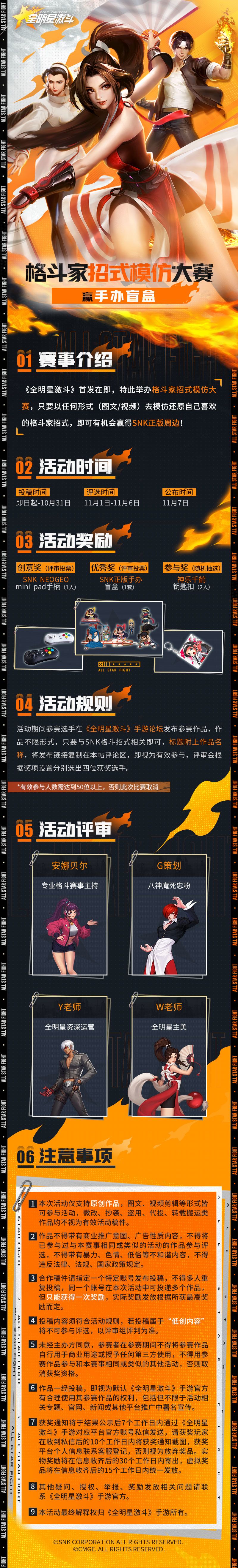经纪人只要以任何形式(图文/视频)去模仿还原自己喜欢的格斗家招式,将作品发布在论坛,在本帖评论区贴上链接,即有机会抽取贝尔准备的手办盲盒以及其他惊喜福利,具体比赛规则可查看下方长图哦✧(^_-✿ ~