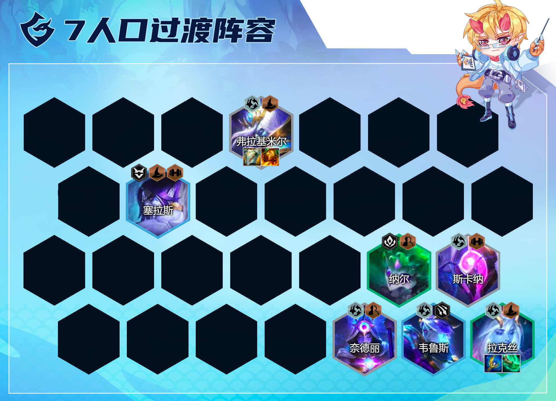 4阶段看经济情况3-5或4-1升7人口,7人口不多做停留,棋子方面看情况添加纳尔或高坦度棋子都好。