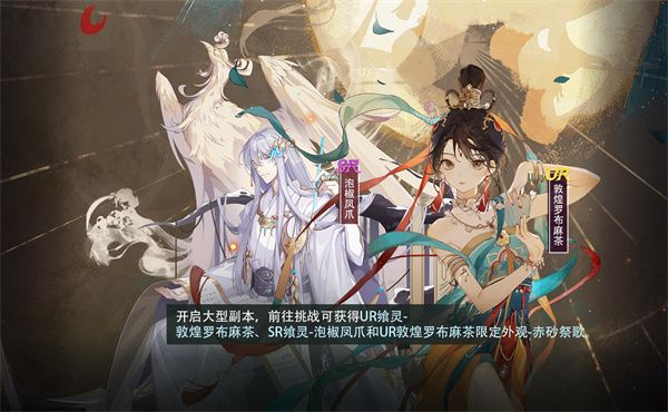 活动描述:万里朔漠连天晖,灼日金砂覆地茫。笙乐琅音,传颂远古歌谣。乱风尘烟,倾覆窟中之秘。千年凰羽再度现世,殒落或是涅槃,又将由谁书写黄沙之中的命运。活动期间,开启大型副本活动,御侍大人通过挑战活动关卡,有机会获得UR飨灵-敦煌罗布麻茶、SR飨灵-泡椒凤爪和UR敦煌罗布麻茶限定外观-赤砂祭歌。副本奖励领取时间延长至10月17日23:59,副本结束后仍可兑换,御侍大人不要错过哦~