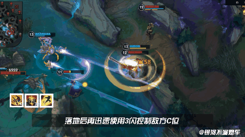 实战中,我们可以大招先手敌方前排,以此来接近后排,落地后再迅速使用 E闪(3闪)控制敌方C位,集火将其秒杀。