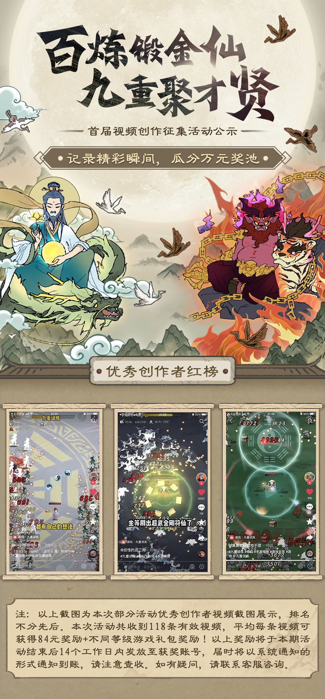 本次活动共收到118条有效视频,平均每条视频可瓜分84元现金及对于对应等级的游戏礼包!