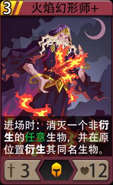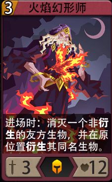 3、火焰幻形师:火系生物卡,3费3攻12血,进场时:消灭一个非衍生的友方(任意)生物,并在原位置衍生其同名生物。