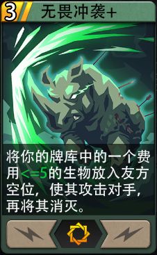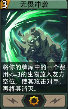 1、无畏冲锋:木系魔法卡,3费,从你的牌库中选择一个费用<=3(5)的生物放入友方空位,使其攻击对手,再将其消灭。。