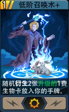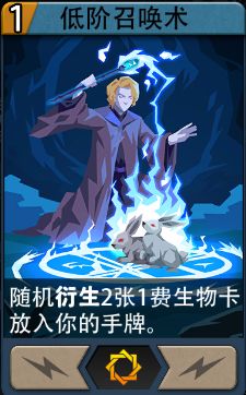 2、低阶召唤术:水系魔法卡,1费,随机衍生2张(升级的)1费生物卡放入你的手牌。