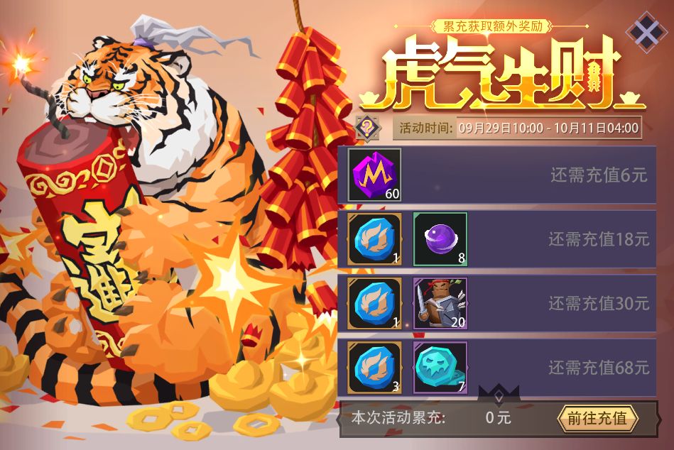 活动内容:招财福虎降临,带来丰厚的回报。活动期间,以任意形式累计充值金额达到指定额度,即可领取额外奖励。