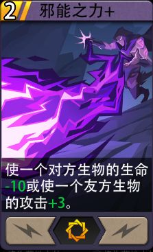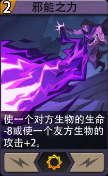 4、邪能之力:暗系魔法卡,2费,使一个对方生物生命-8(10)或使一个友方生物攻击+2(3)。