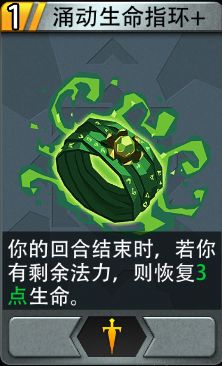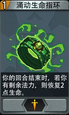 5、涌动生命指环:主角装备卡,1费,你的回合结束时,若你有剩余法力,则恢复2(3)点生命。