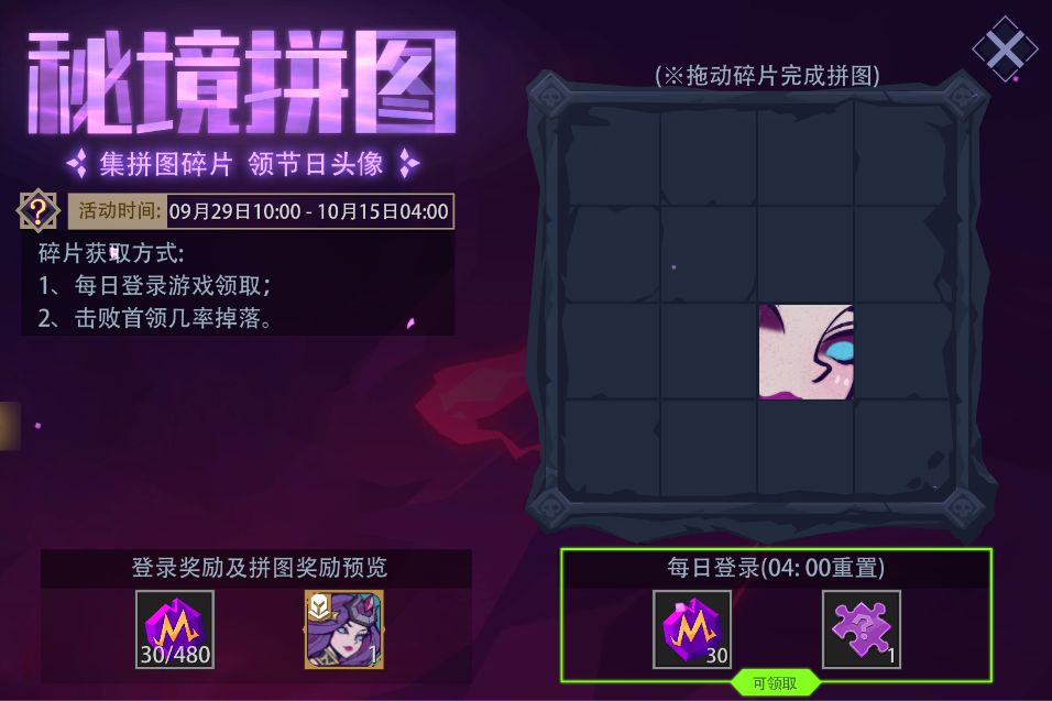 活动内容:每日登录游戏可领取魔晶及随机拼图碎片奖励。另外,在冒险/梦魇模式下击败首领也有几率掉落拼图碎片。集齐所有拼图并拼凑出完整的图案,还可获得限定节日头像。