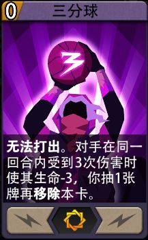 三分球:特殊魔法卡,0费,无法打出。对手在同一回合内受到3次伤害时使其生命-3,你抽1张牌再移除本卡。