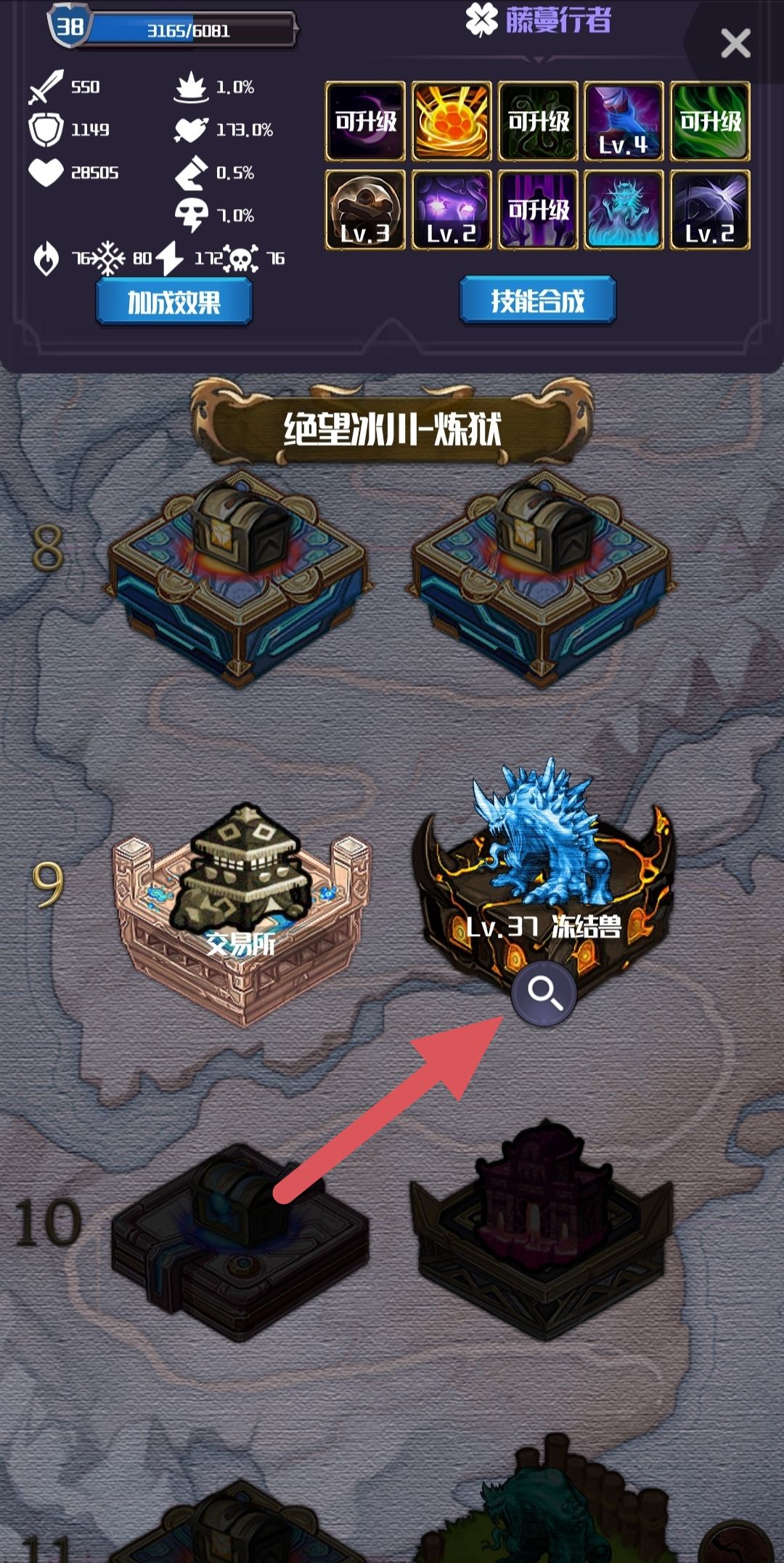 如下图点击怪物下面的放大镜,可以查看怪物随机到的技能。特别打boss以前看看他的技能,看看自己能不能够进行针对,这才是战斗胜利的保证。