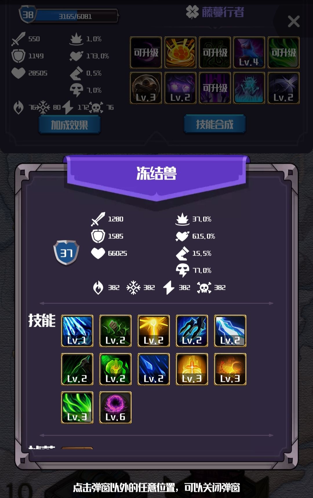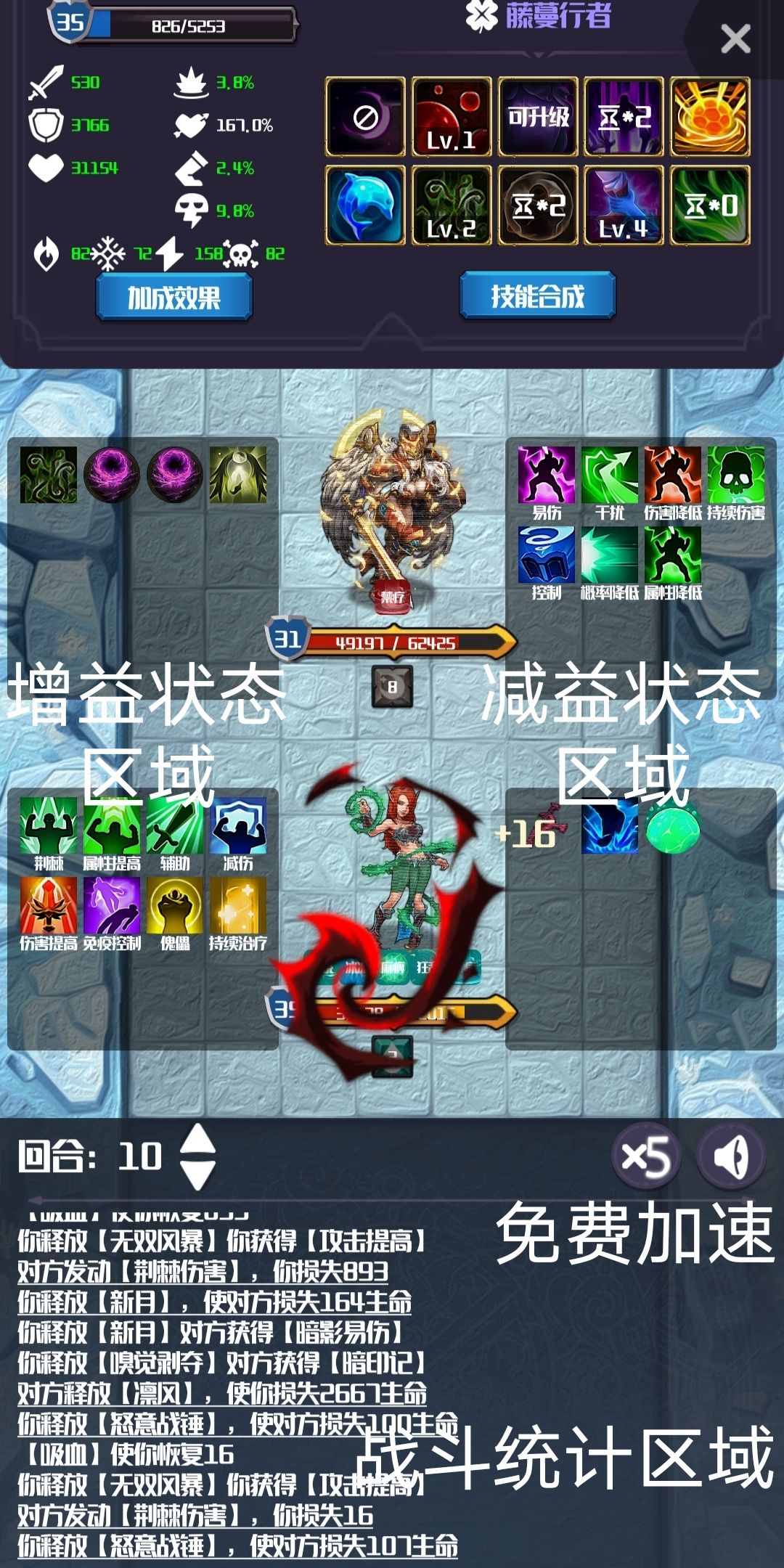 战斗是自动的,有提高各种技能几率的技能。还有各种不同作用的buff。