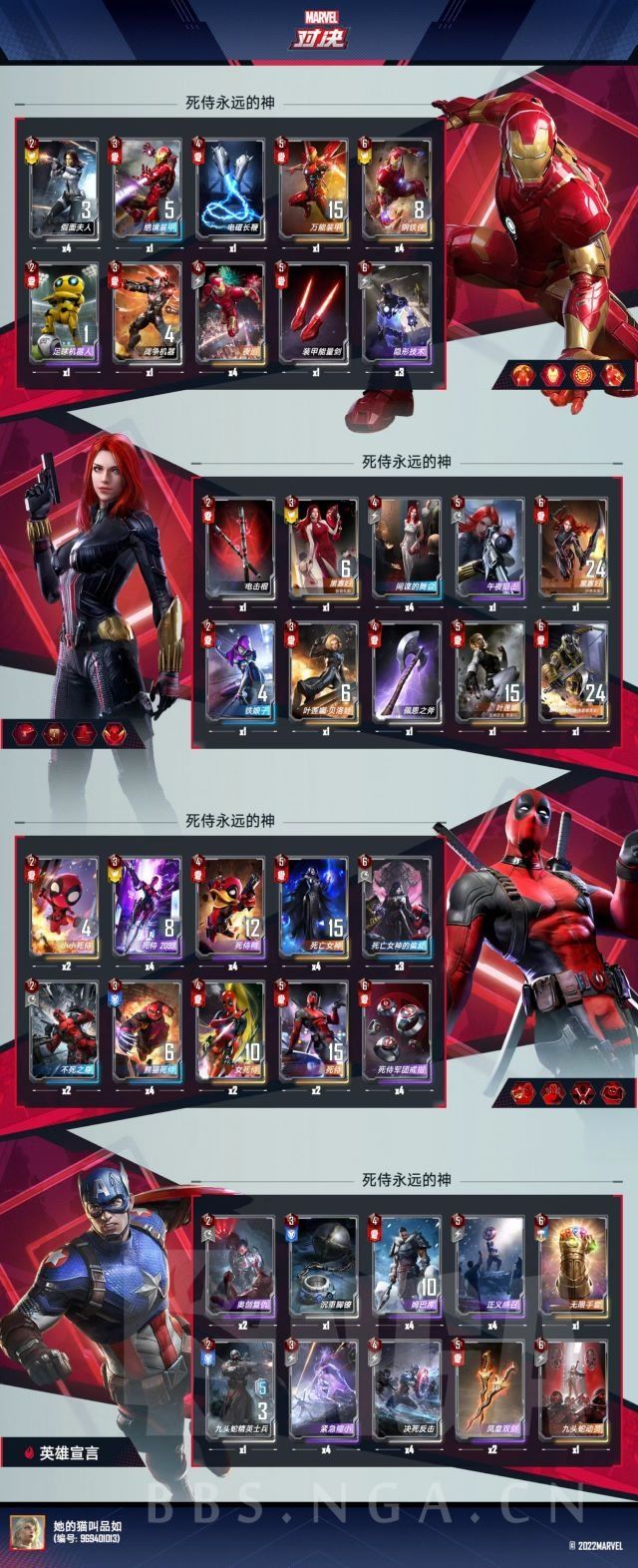 大家好,我是品如,游戏名:她的猫叫品如(ID:969401013)老炉石玩家,漫威从国服公测开始玩,每个赛季上王后开始摆烂(这游戏是好游戏,但是奈何官方奖励跟活动真的没有肝的欲望,今年整的新模式新玩法就不吐槽了,懂的都懂),现在每日做做任务清清箱子就跟妹子打鹅厂王者去了。近期S12新版本更新了,奉上一套每个赛季一直能打并强度在线的老卡组,希望能给这游戏的新玩家们一点参考(萌新应该没有了吧,其实我是为了拿利爪卡背,非本人原创,部分卡位有调整,如果有喷子的话那你说的都对,我赞成,我不反驳)。