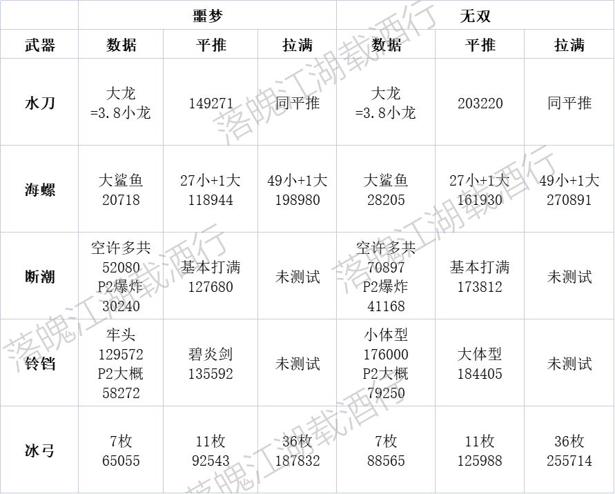水刀测了噩梦及无双图,其它武器只测了噩梦图,对应的无双图伤害直接用公式。
