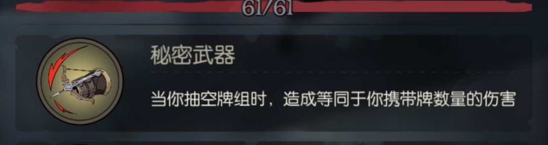 如:我卡组剩下2张牌,手牌是预备路线和包扎,弃牌区剩1张牌,此时我使用包扎,丢弃预备路线,再抽2张牌,在这里会先判定秘密武器,由于卡组为0,所以造成1次伤害。