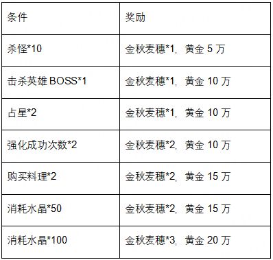 活动期间达成击怪*10、击杀英雄BOSS*1、占星*2等限时任务后,每日都可获得黄金和金秋麦穗~
