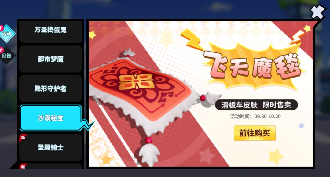 活动内容:限定传说载具皮肤【滑板车·飞天魔毯】售卖