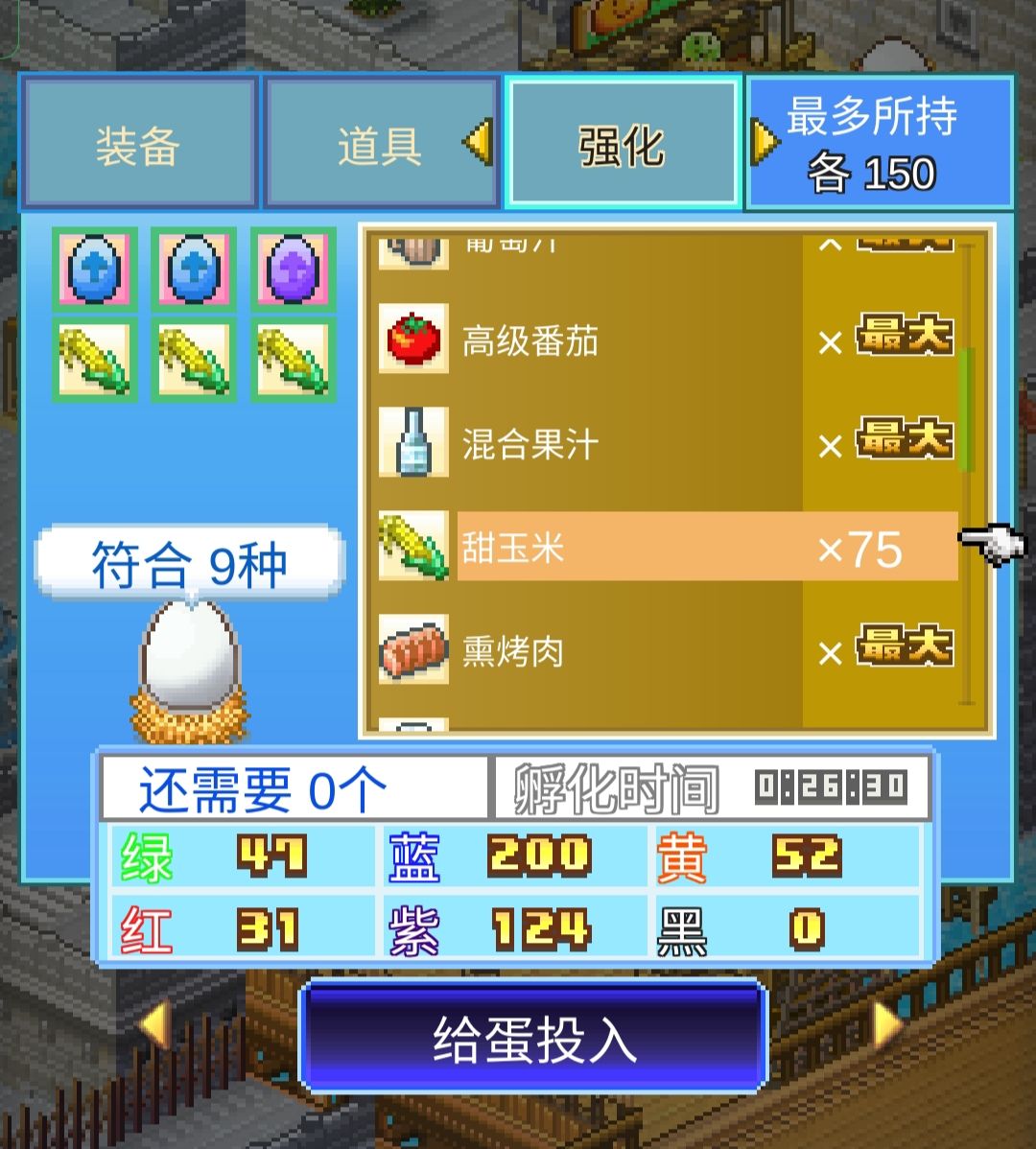 3:孵贝贝子改很多时候都容易缩小到9种可能,比较方便的配方是2个蛋蓝提升,1个蛋紫提升,3个甜玉米。