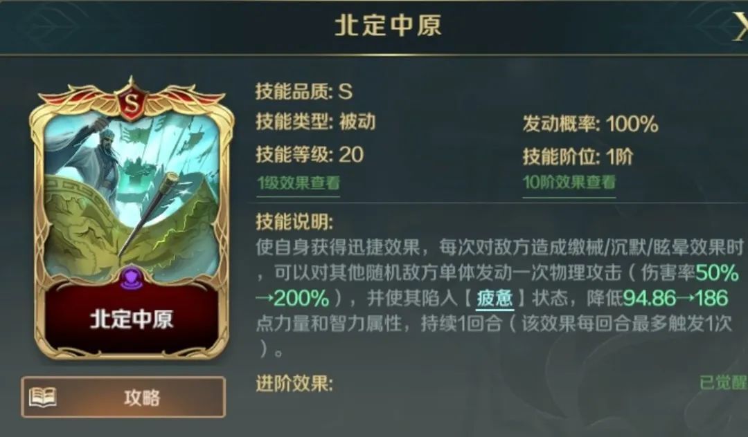 可以与【银盾步兵】联动大幅降低首次处于晕眩状态的敌军单体属性,与【北定中原】配合,能对敌军达到双减益的效果。