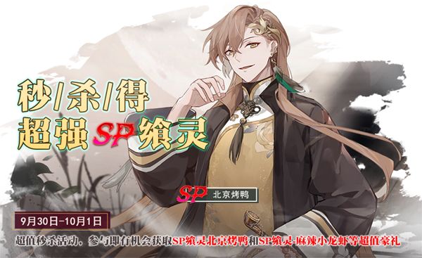 活动描述:活动期间,购买指定礼包开启限时秒杀,获取礼包内幸运字符即有机会兑换SP飨灵-北京烤鸭、SP飨灵-麻辣小龙虾等超豪华大礼哦~