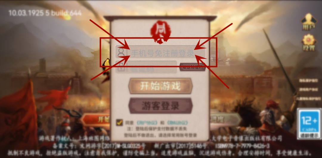 打开游戏,在登录界面别急着去点“游客登录”,而是要在弹出窗口的第一行框内(如图)输入自己的手机号码。(需要注意:填写的手机号码需之前从未登录过任何厚土旗下战棋游戏的手机号码)