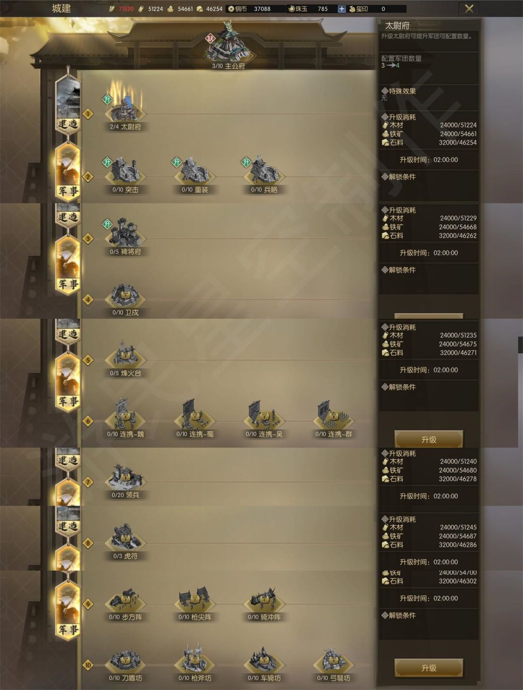 升级太尉府可提升军团可配置数量一个城池最多拥有5个军团,拥有更多的军团意味着有更多的行动力,可以参与到屯田、占地、战斗等行动中。