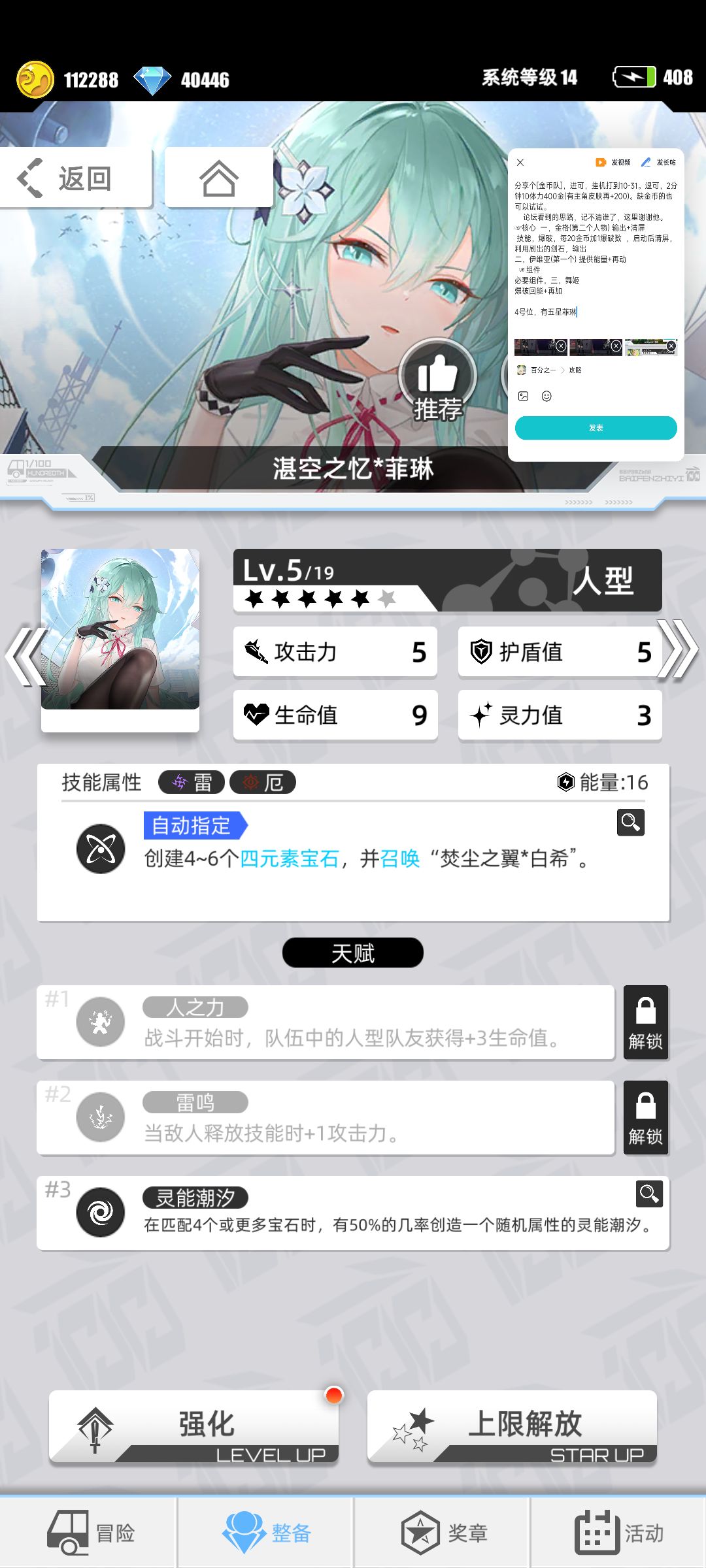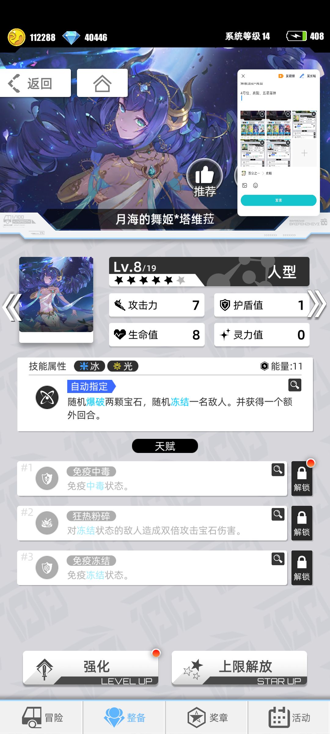 优点,大概率可以再动,召唤防翻车。激活天赋3,四消召唤灵能潮汐(一种宝石出现概率增加),因为队伍只没有火元素,会增加再动可能性,提高效率。