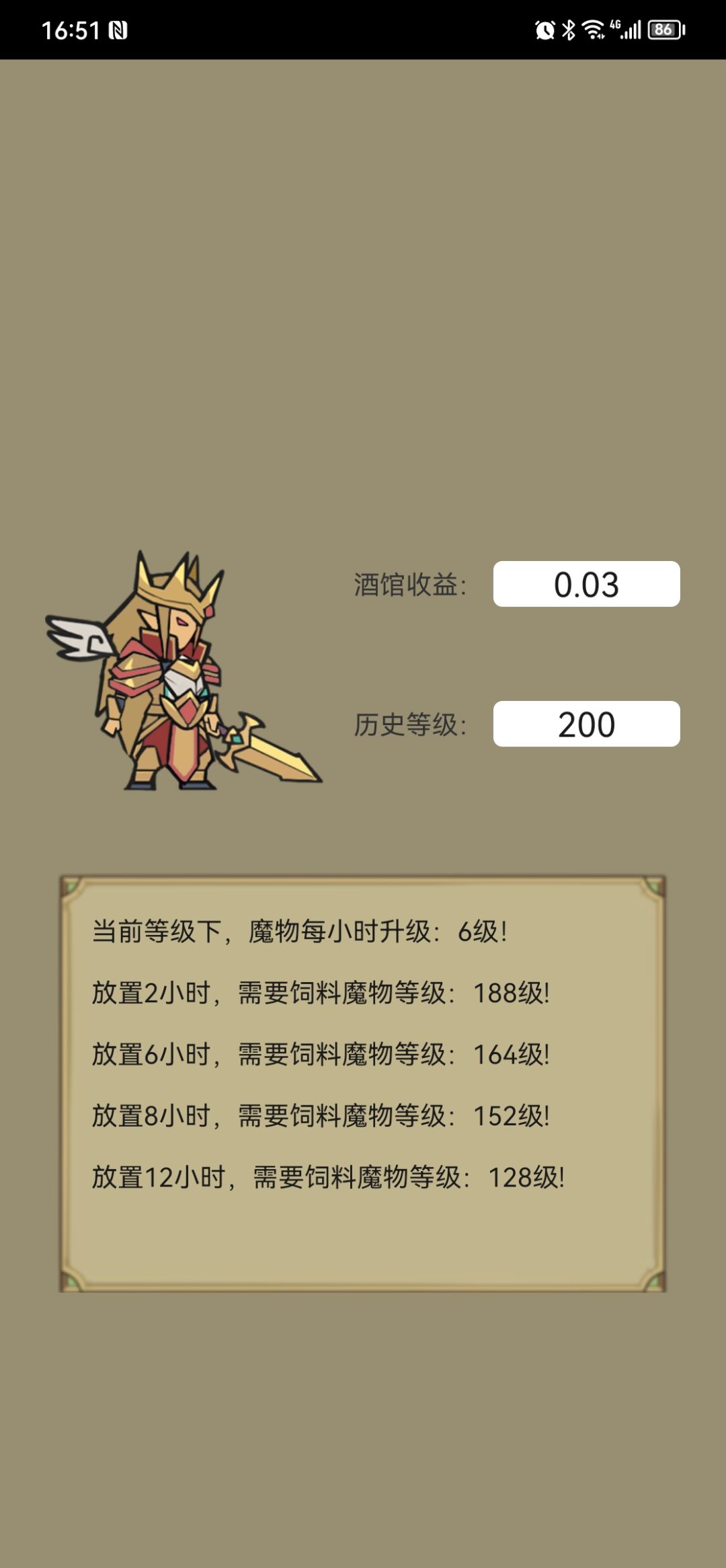 假设你已经有一个魔物200级了,这个时候你刚好只有资源升级4个128级的,这个时候,你把这4个不需要的128级魔物存放进酒馆,然后等待12个小时以后拿出来,这4个魔物就变成200级了,然后你再将这4个魔物双倍回收掉(回收比重置好因为双倍回收给双倍钻石),获得的70%的资源去升级之前200级的魔物(会升很多),然后再重新把最高等级魔物的级别输进酒馆计算器,然后获得新的收益情况。