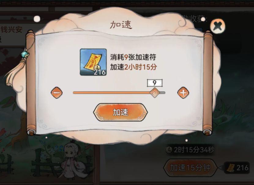 如图,完成时间需要2小时15分54秒,2小时15分 = 15*9 ,多出来的54秒会导致系统多消耗我们1张加速符