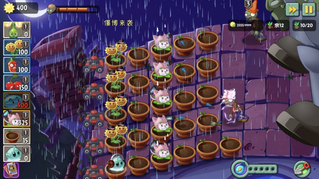 首先竖排第三排种5个猫草,后面种4-5个阳光。第一波僵尸如果打不赢,可以用花盆顶在前面,一般有2个猫草就够了,还不够,用樱桃,尽量炸三个且有一个是铁盔,不中冰瓜。博士第一次低头前可以种满五个猫草。等博士掉了第二条血,一定会砸汽车,前面少种了冰瓜,减少了植物损耗。砸完后种的花盆优先给猫草,立刻种猫草,竖排第二排还有位置就种冰瓜。再就是拿盾牌的僵尸出现,一定要把花盆种在它脚下,让他咬花盆,没有时间丢冰块,有冰瓜控制,一直种花盆,盾牌僵尸丢不出冰块,如果还不够就上樱桃。等博士掉完第三条血,在竖排第四排,种三个阳光,2个猫草。这样就够了。然后植物前面最好是有2排花盆,这样可以给足自己反应博士是冰球还是火球的时间。博士吐球,我是事先点上冰,另一只手,点辣椒,随时准备切换灭球。是火还是冰,可以在博士吐球之前的一刹那看的出来,要反应快,就这么多。