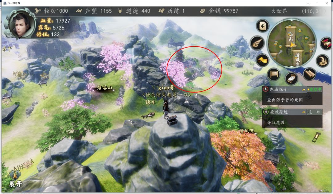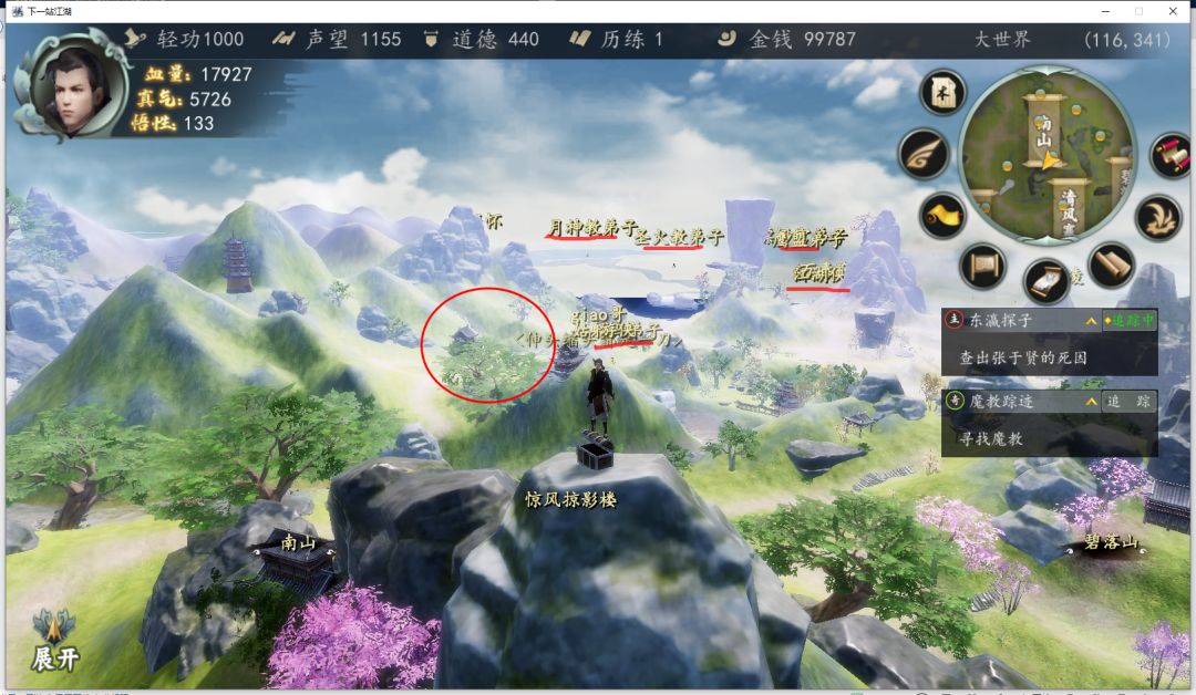 (南山右手边画圈就是杭城,往左能看到蓉城刷新的NPC和绝大多数其他地方的NPC,位置极佳)