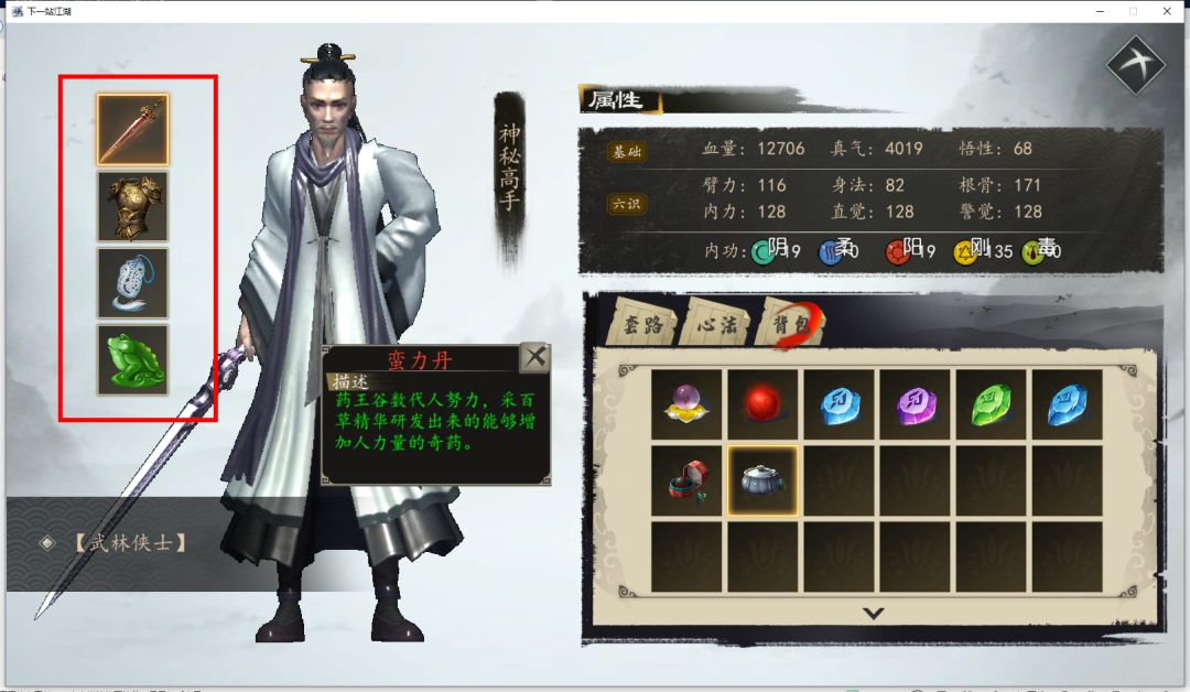 (神秘高手,一身好装备撼天剑,八蛟袍,化什么玉佩,万毒王毒内功+20%但是你得不到,气不气?决斗也没用)