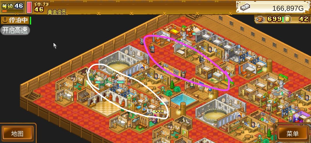 上层是对称的,紫圈放点练熟练度的圈上离楼梯最近的放清甲板的,白圈商业街有价格加成,白圈下是刷职业技能书的丢那练满了送别,技能书到手。