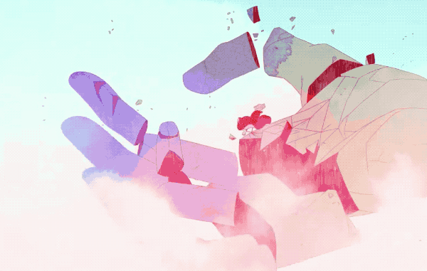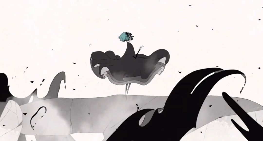 Gris站在巨像上高声歌唱,歌声浸入周围的溶溶色彩。巨像碎裂,女孩失去声音,跌入到了灰白中。