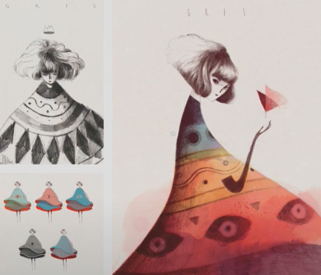 比如Gris衣服的变化代表不同的能力——这或许来自Conrad曾为服装品牌Zara服务的经历,一开始他想用裙子的色彩来体现成长,像这样: