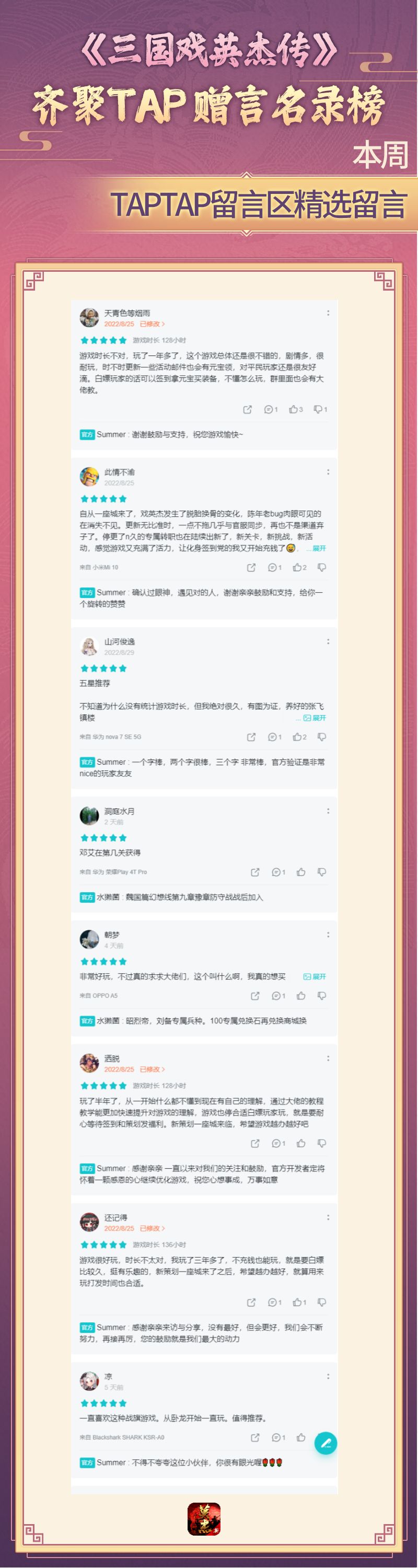 在这里,每周都有许多主公们在TAPTAP的留言区给“戏英杰”游戏送出许多肯定、赞许、鼓励的话语。在此我们特别感谢能够在TAPTAP这个重要的游戏平台上给予“戏英杰”最大支持的各位主公们!