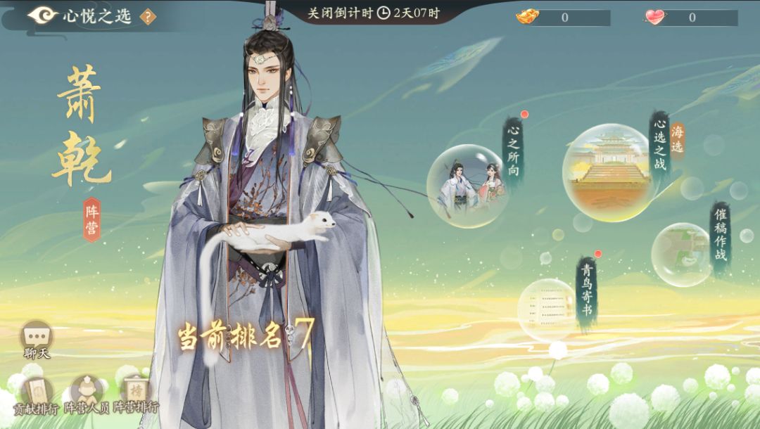 3)心之所向:在心选之战的海选和决赛阶段,君卿们可以在两个阵营中使用心选券选择本日积分获得最多的一方,若选择正确,则将获得翻倍数量的心选券。心选券可在商城中兑换道具。